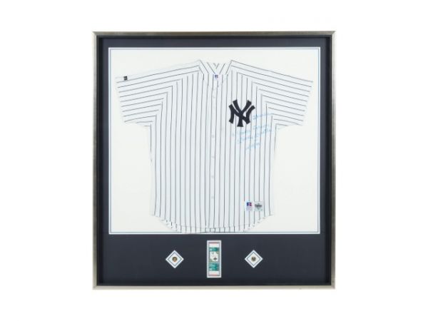 A New York Yankees jersey, signed and inscribed by Mickey Mantle in 1993 and presented to the Toronto Blue Jays as a token of appreciation for the team having invited him to the World Series that year, along with his ticket to the game, in a 52 inch by 49 inch frame, sold for $5,015, more than doubling the high estimate. He wrote, “Thanks. Forever a Yankee, Mickey Mantle.”